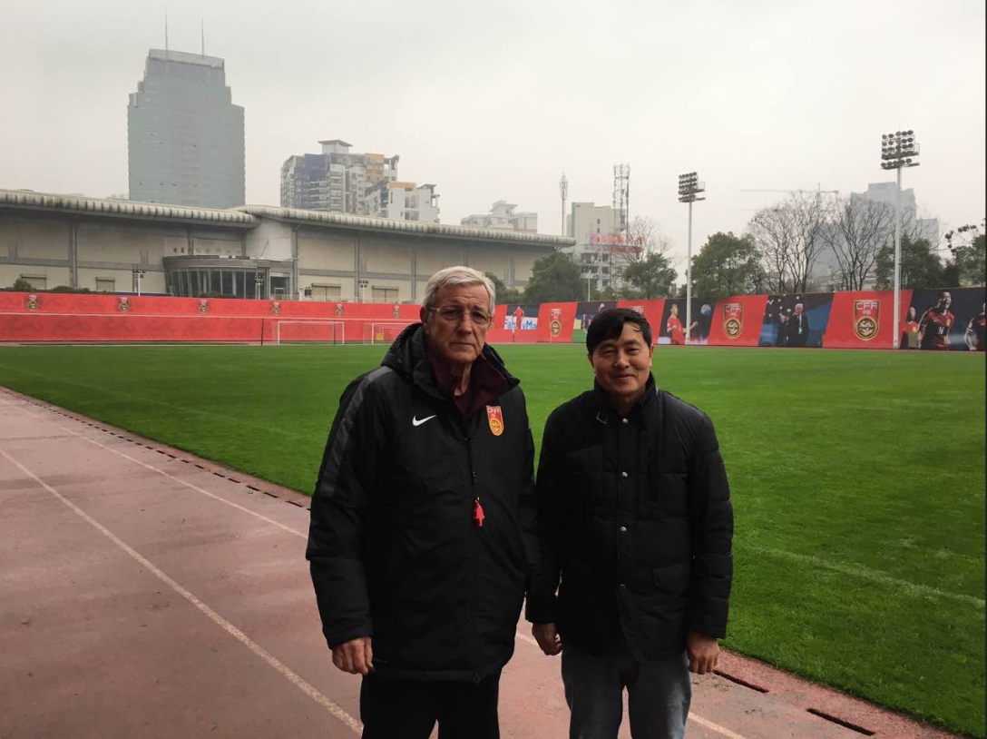 向佐湘教授在公司承建的贺龙体育中心足球场与国足总教练里皮合影