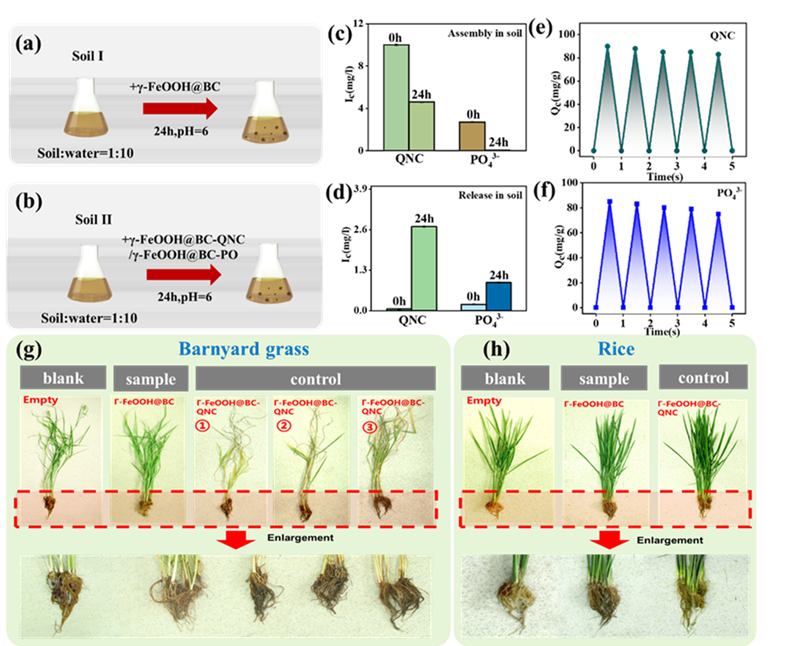 图1 土壤中组装行为示意图(a)和数据直方图(c)。土壤中释放行为示意图(b)和数据直方图(d)。γ-FeOOH@BC对(e) QNC和(f) PO43-的敏感性测试。不同水培条件下稗草(g)和水稻(h)的代表性数码照片。