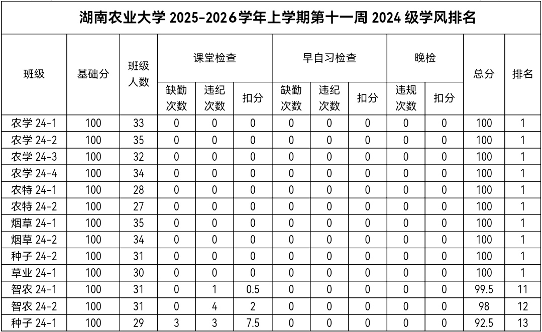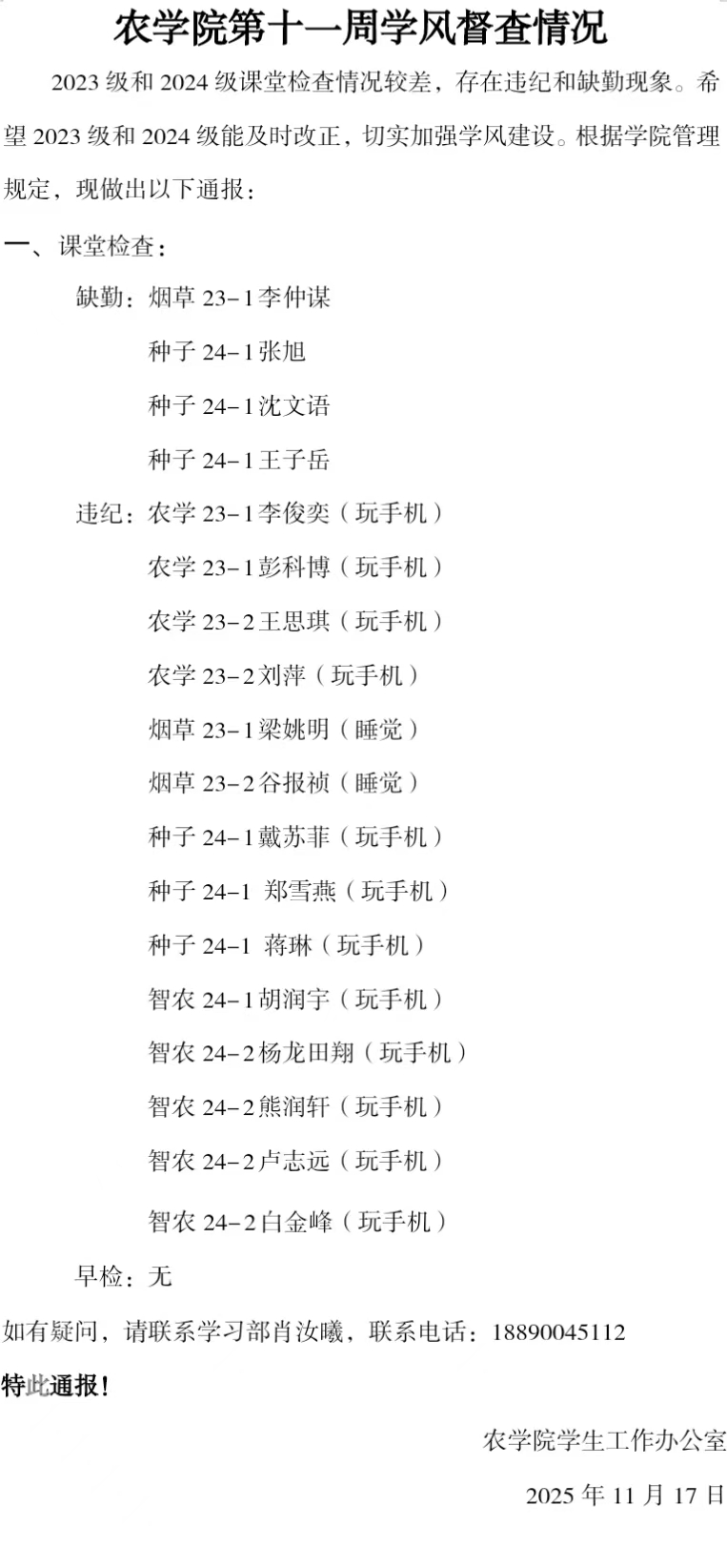 2023级、2024级课堂检查情况较差,存在违纪和缺勤现象。希望2023级、2024级能及时改正,2025级继续保持优良作风,切实加强学风建设。